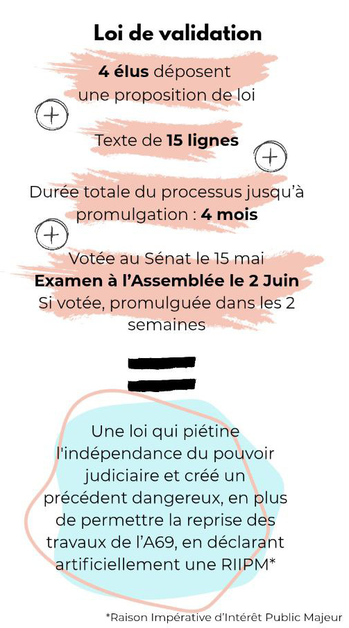 Un quarteron de parlementaires tarnais a déposé récemment une proposition de loi qui veut neutraliser une décision de justice. Cette loi, en validant à posteriori la Raison Impérative d'Intérêt Public Majeur (RIIPM) de l'A69, prétend en effet, annuler le jugement du 27 février rendu par le Tribunal Administratif de Toulouse. Cette loi créerait un précédent dangereux, bien au delà de l'A69 : la fin d'une justice indépendante, la rendant subordonnée à l'arbitraire du pouvoir exécutif.